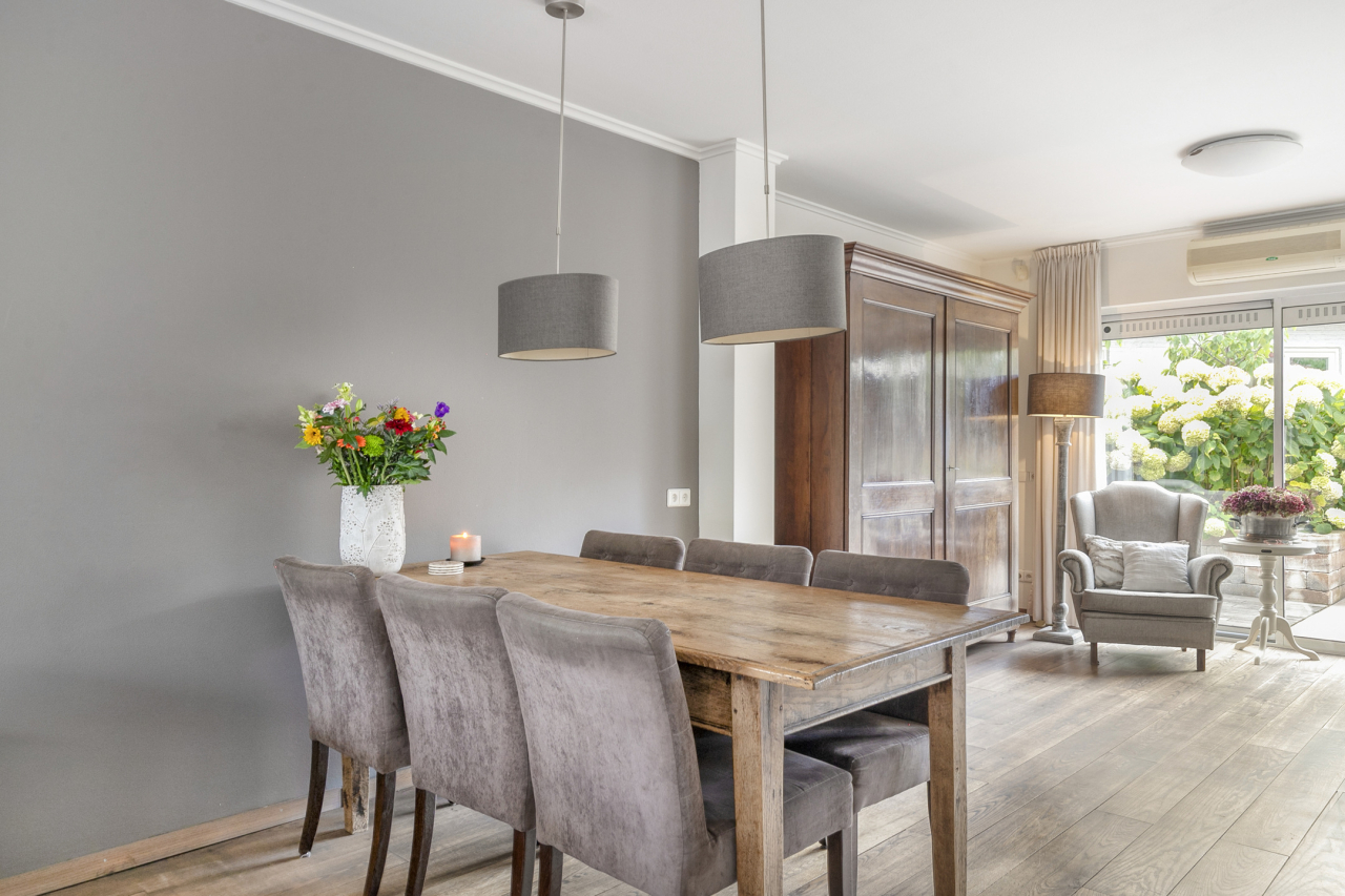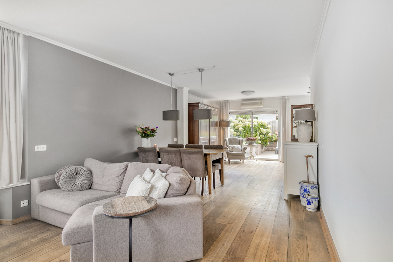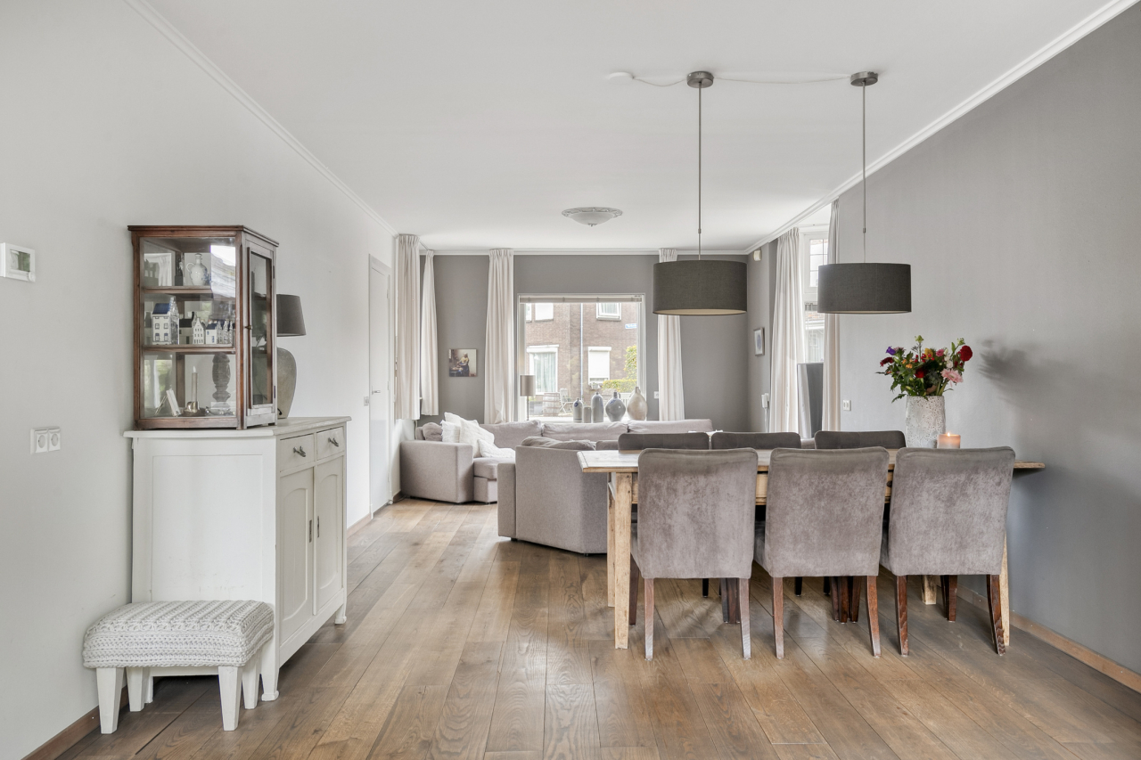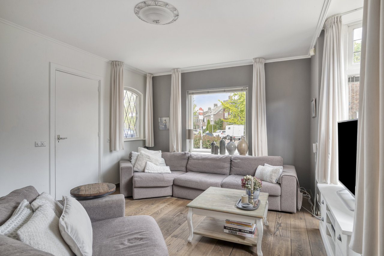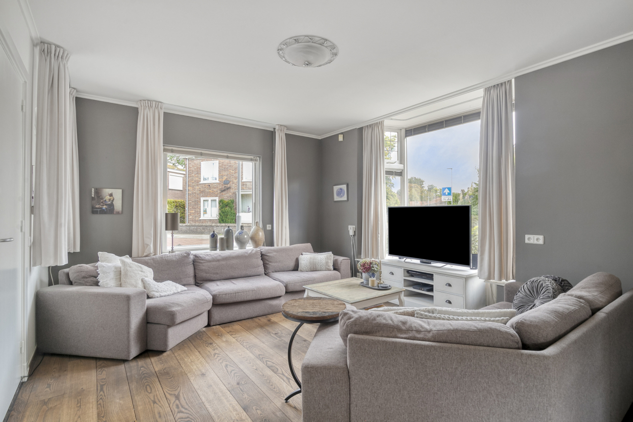 De sfeervolle woonkamer met erker en glas in lood ramen, is voorzien van diverse grote ramen waardoor veel lichtinval. Aan de voorzijde is de zithoek met zicht op het Thorbeckeplein. Aan de achterzijde is de eethoek met schuifpui naar de zonnige tuin.