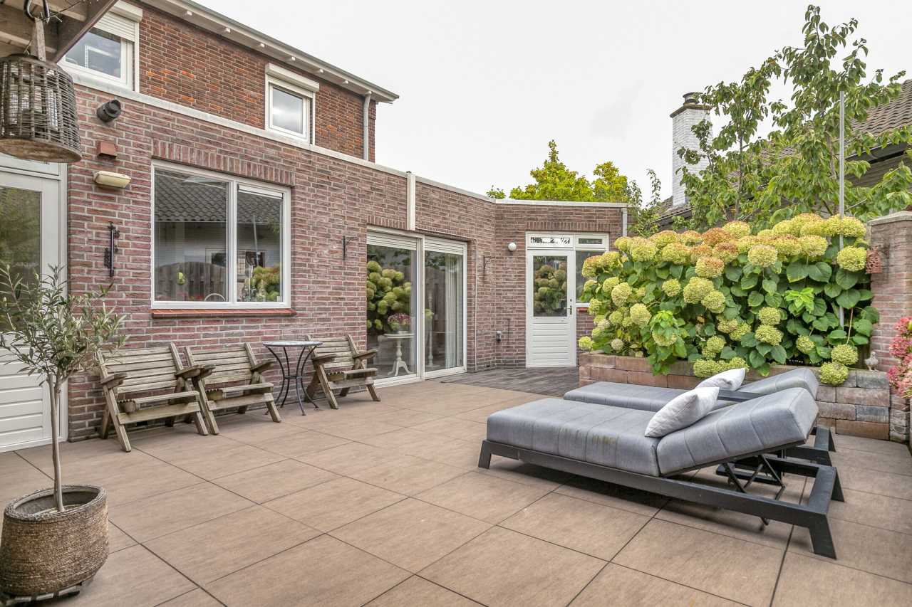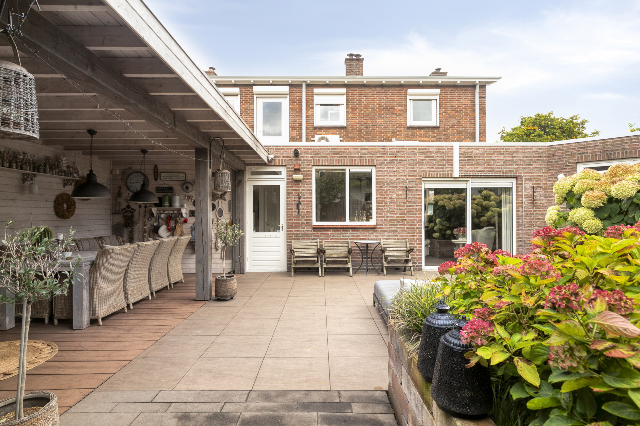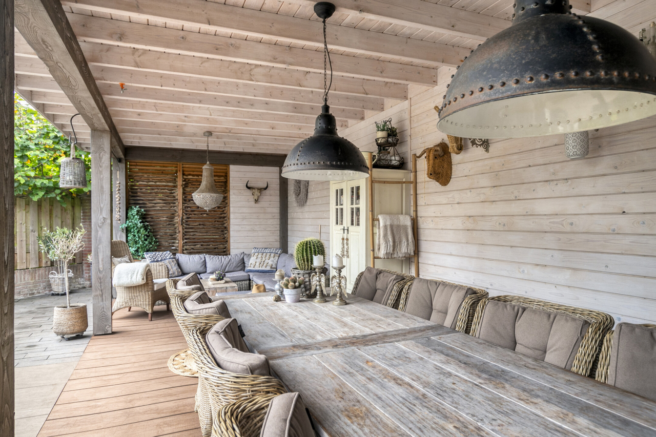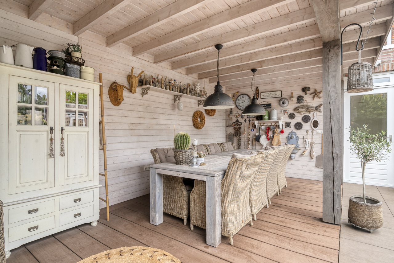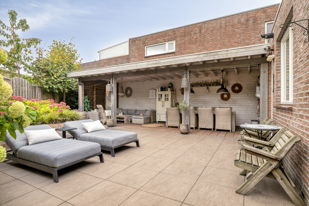 Achter de woning ligt een onderhoudsvriendelijke tuin met fraaie, grote overkapping waardoor je al snel buiten kunt zitten De tuin is grotendeels voorzien van sierbestrating. Verder diverse borders en stenen plantenbakken met bomen en struiken. De achtertuin ligt op het Zuidwesten en zorgt voor vele uren zonplezier. Achterin de tuin is ruimte voor de containers.