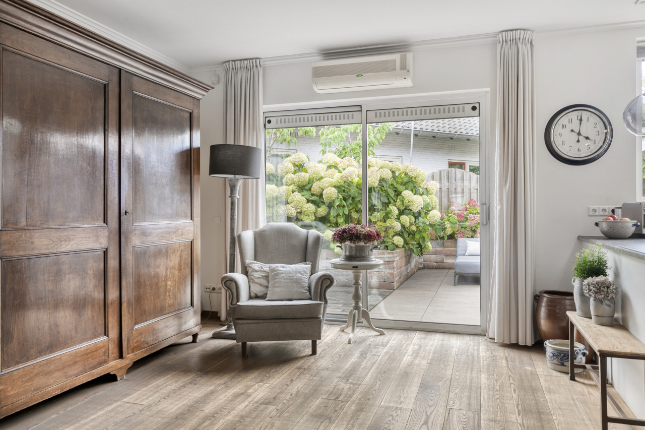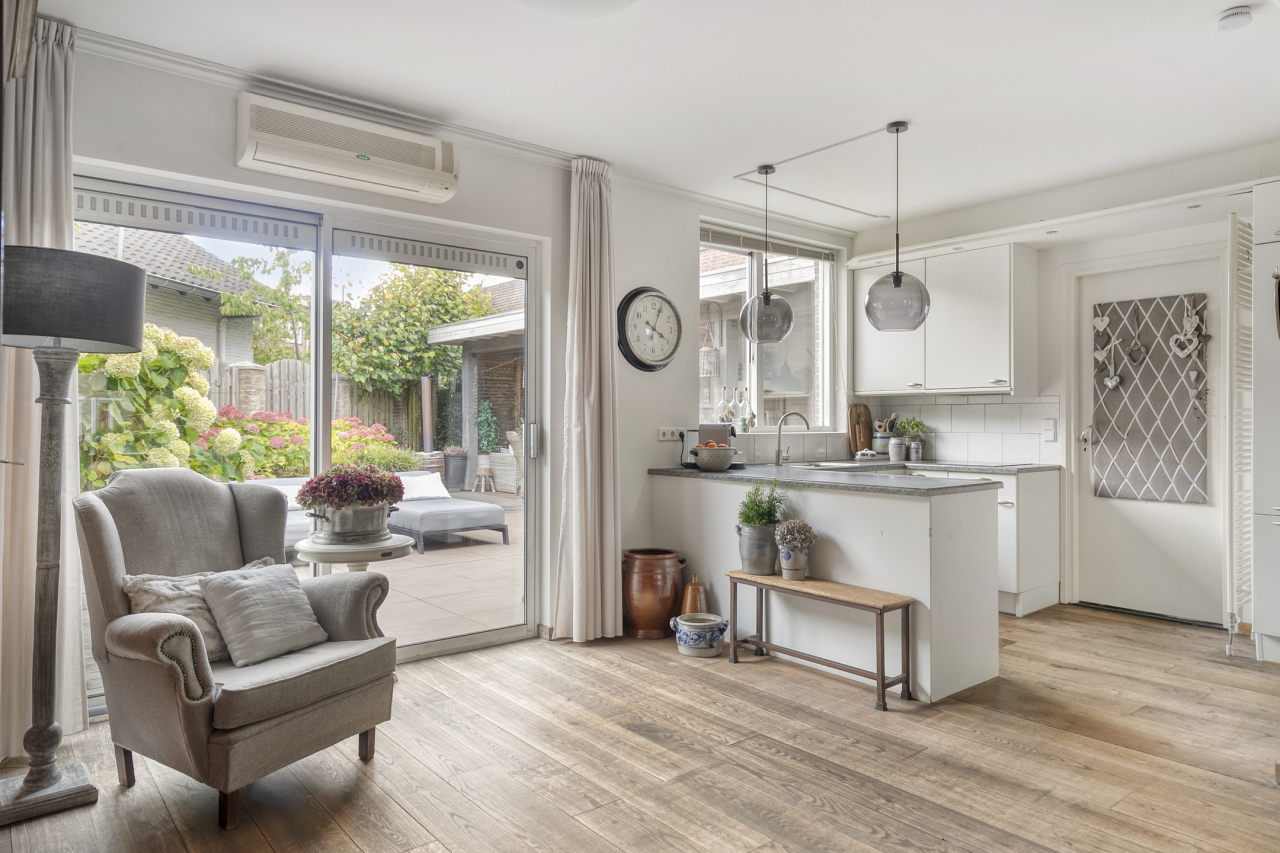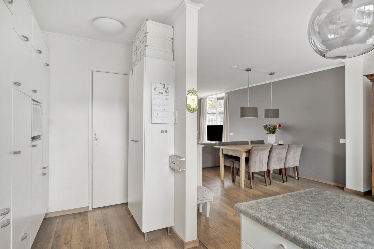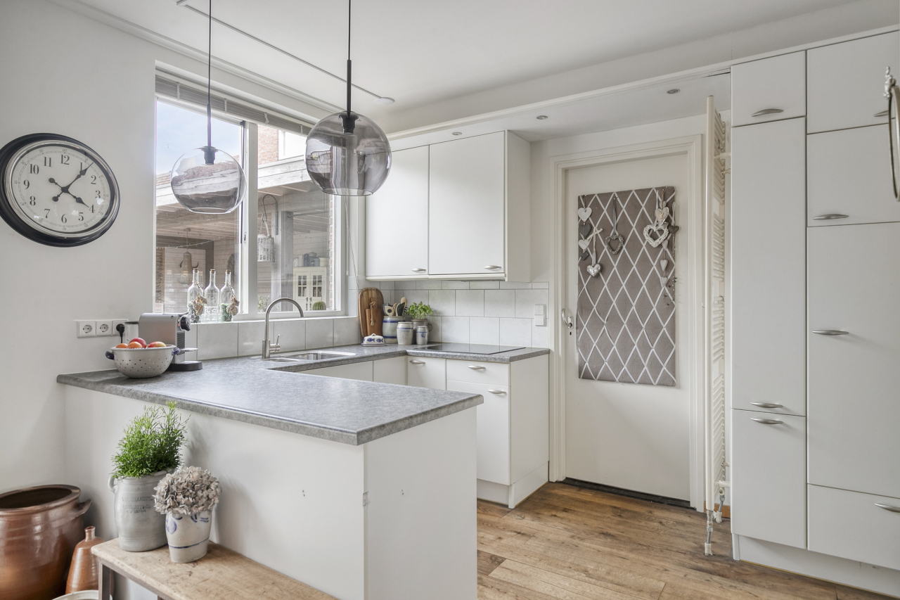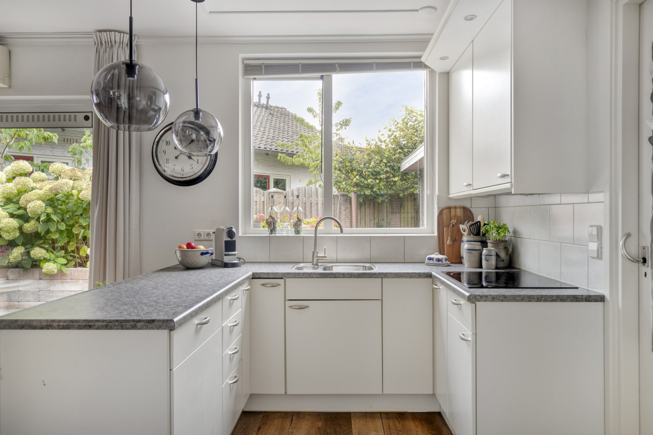 De open keuken met aanrechtblad in U-vorm met 1,5 spoelbak is voorzien van diverse keukenkasten en inbouwapparatuur zoals een 4 pits inductie kookplaat, Miele vaatwasser, Bosch oven/magnetron. In de keuken met eikenhouten vloer zijn deuren naar de bijkeuken en praktische kelderkast. Aansluitend aan de keuken ligt de betegelde bijkeuken met lichtkoepel, keukenblok, de witgoedaansluitingen en inbouwkast met de Remeha CV HR combiketel. Er is een deur naar de winkel-praktijkruimte en buitendeur naar de tuin.