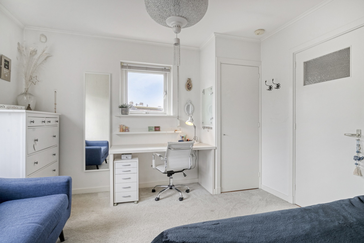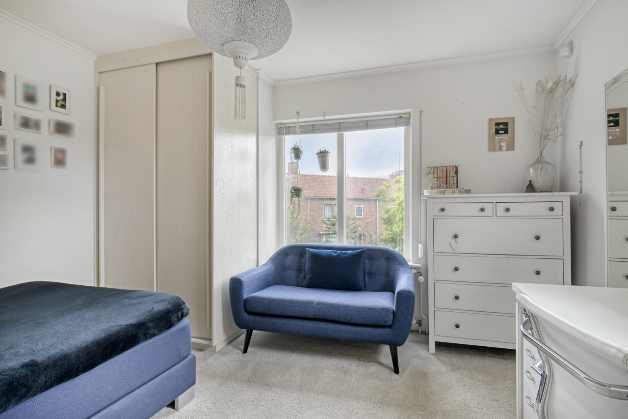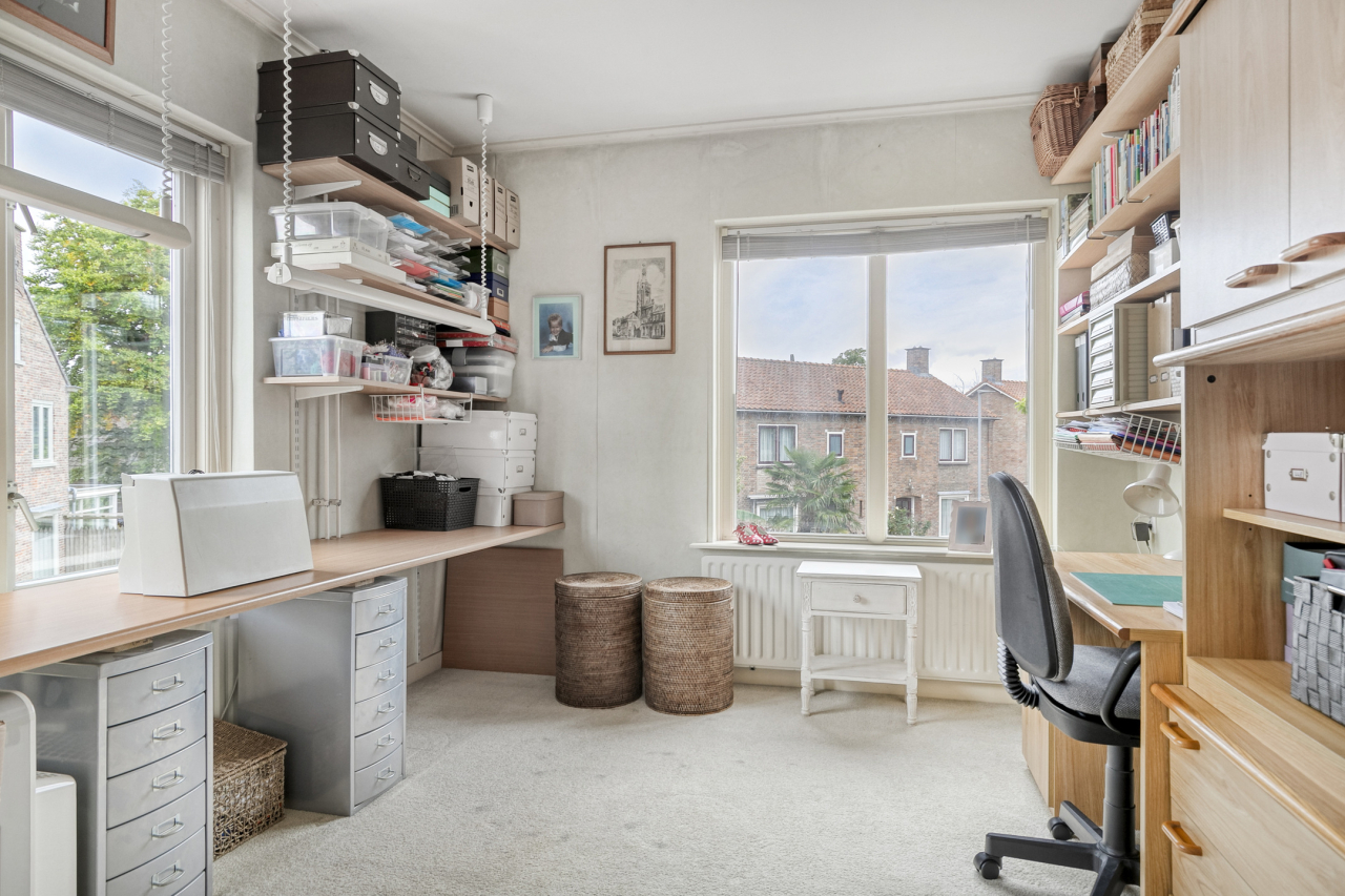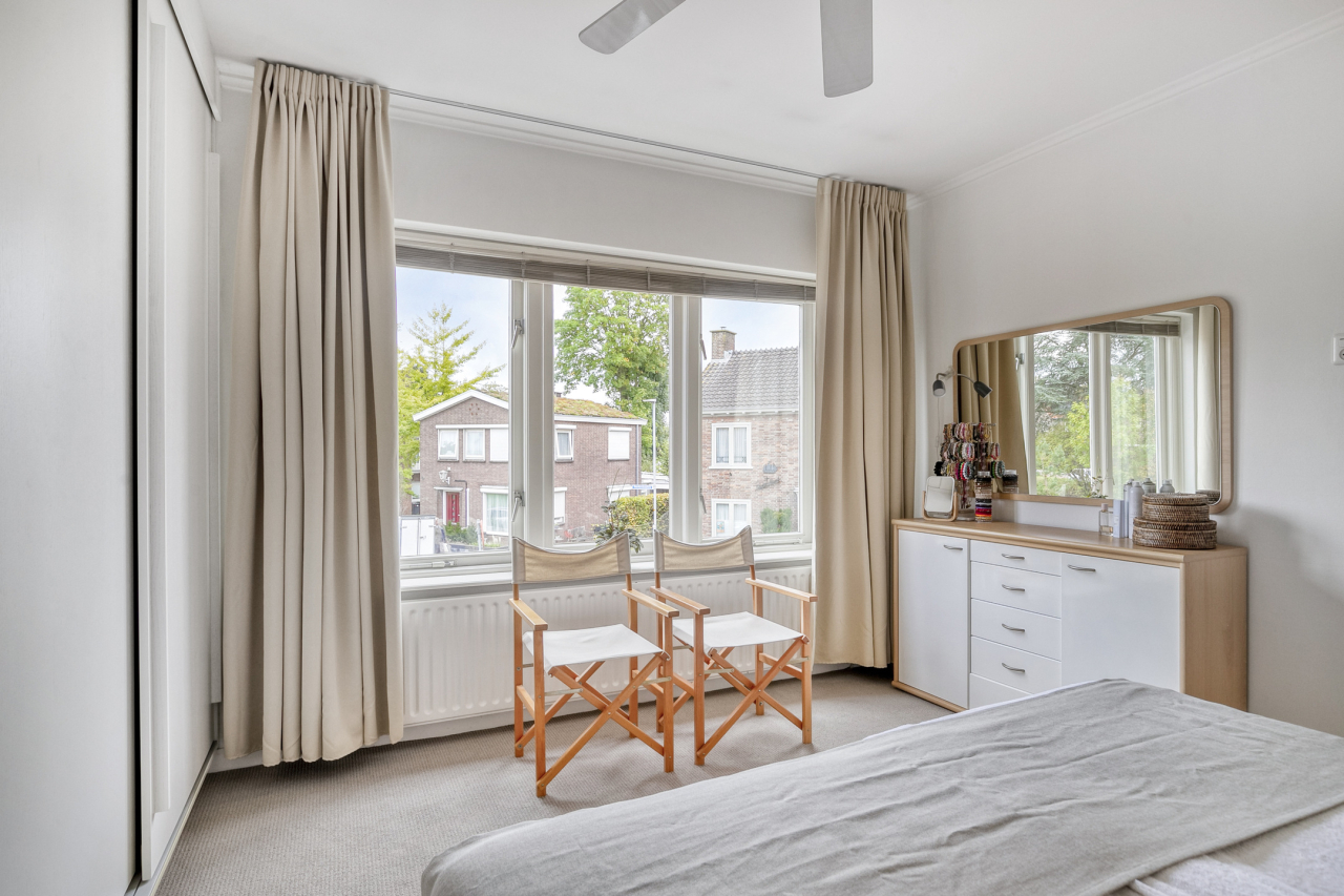 Via de houten trap in de hal is de overloop op de 1e verdieping bereikbaar. Aan de overloop liggen 4 ruime slaapkamers, een berging en de badkamer. De gehele verdieping is voorzien van lichte vloerbedekking. De royale ouderslaapkamer heeft grote ramen aan de voorzijde en zicht op het groene plein. De kamer is voorzien van een grote inbouwkast met 4 schuifdeuren. De 2e slaapkamer is op dit moment in gebruik als werkkamer en ook voorzien van diverse ramen en een inbouwkast. De 3e slaapkamer ligt aan de achterzijde en heeft een deur naar het platte dak en tevens een inbouwkast.