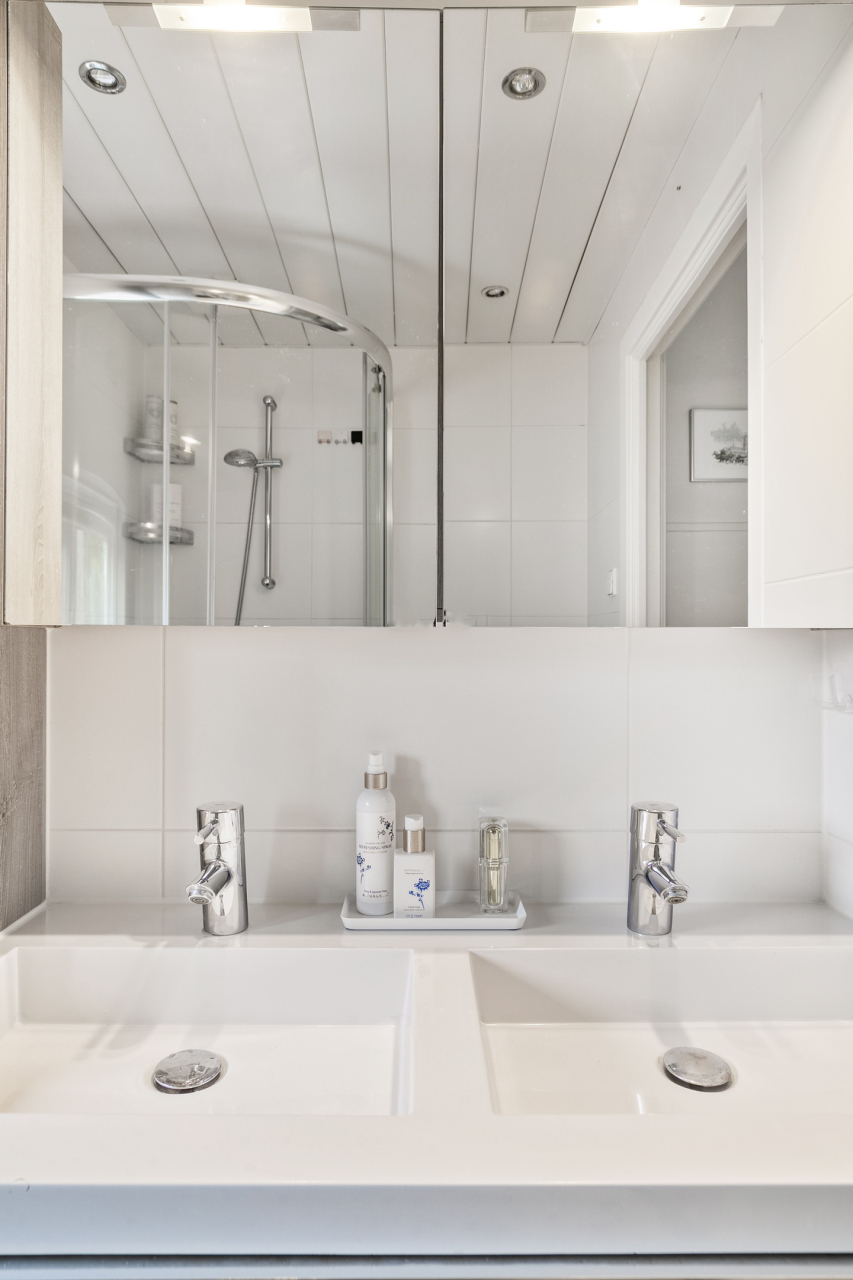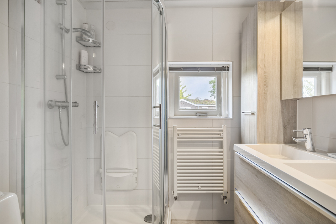 De 4e slaapkamer heeft diverse ramen en 2 inbouwkasten waarvan 1 met 2 schuifdeuren. Beide slaapkamers aan de achterzijde zijn voorzien van rolluiken en tussen deze slaapkamers ligt een praktische berging met raam. De volledig betegelde badkamer met raam en plafond met inbouwspots is ingericht met een douchecabine met thermosstaatkraan, 2e toilet, designradiator en een dubbel wastafelmeubel met grote spiegel.