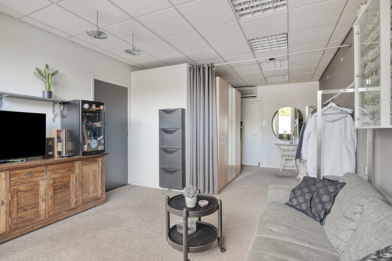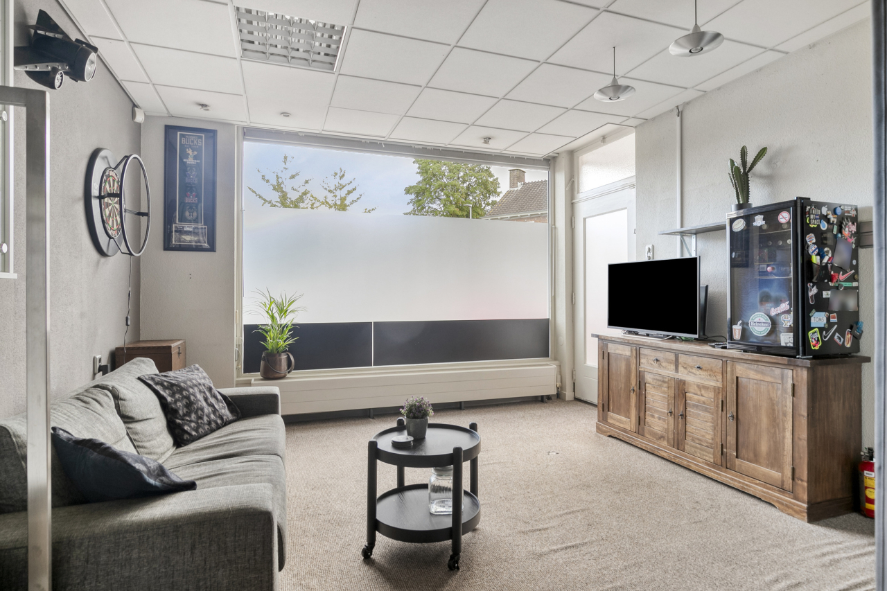 Via de bijkeuken en deur naast de voordeur is de winkel- /praktijkruimte bereikbaar. Deze is voorzien van een groot raam aan de voorzijde en systeemplafond met verlichting. De ruimte is nu in gebruik als zitkamer/tv kamer met opslag maar is voor diverse doeleinden te gebruiken.