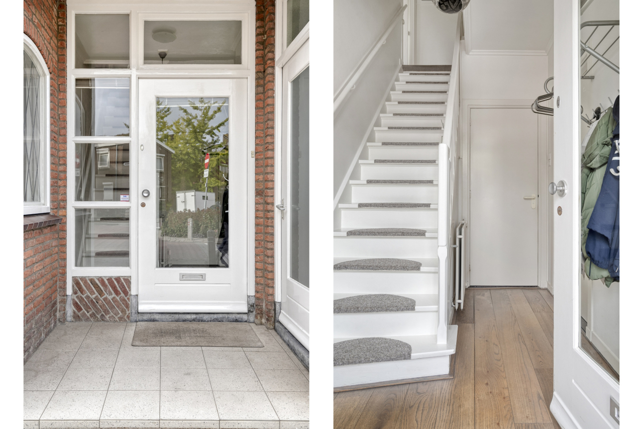 De overdekte entree van de woning is aan de voorzijde naast de deur naar de multifunctionele winkel- /praktijkruimte. Via de hal met trapopgang, meterkast, toilet met fonteintje is de woonkamer bereikbaar. In de hal ligt een eiken houten vloer.