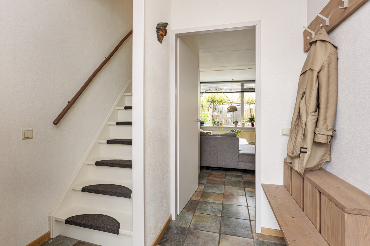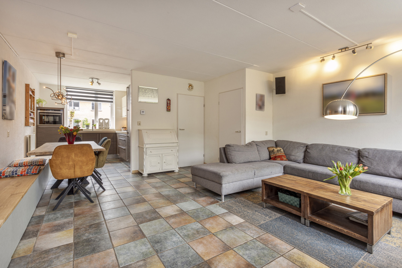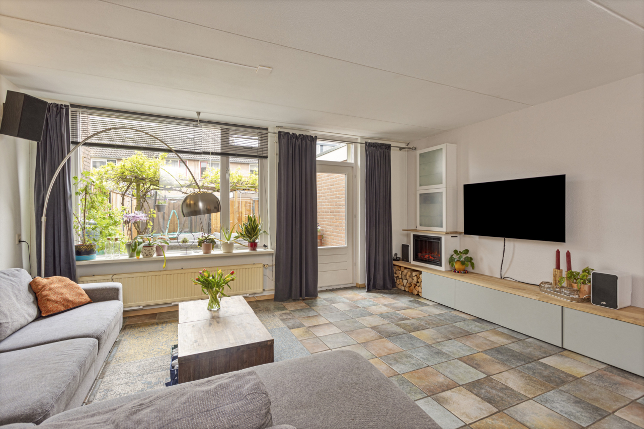 De lichte woonkamer is voorzien van een trapkast en een tegelvloer in aardetinten. Aan de achterzijde is de zithoek met zicht op de tuin. Via een tuindeur is het terras, de berging en zonnige tuin op het Zuiden bereikbaar. De deur en het raam zijn voorzien van een rolluik.