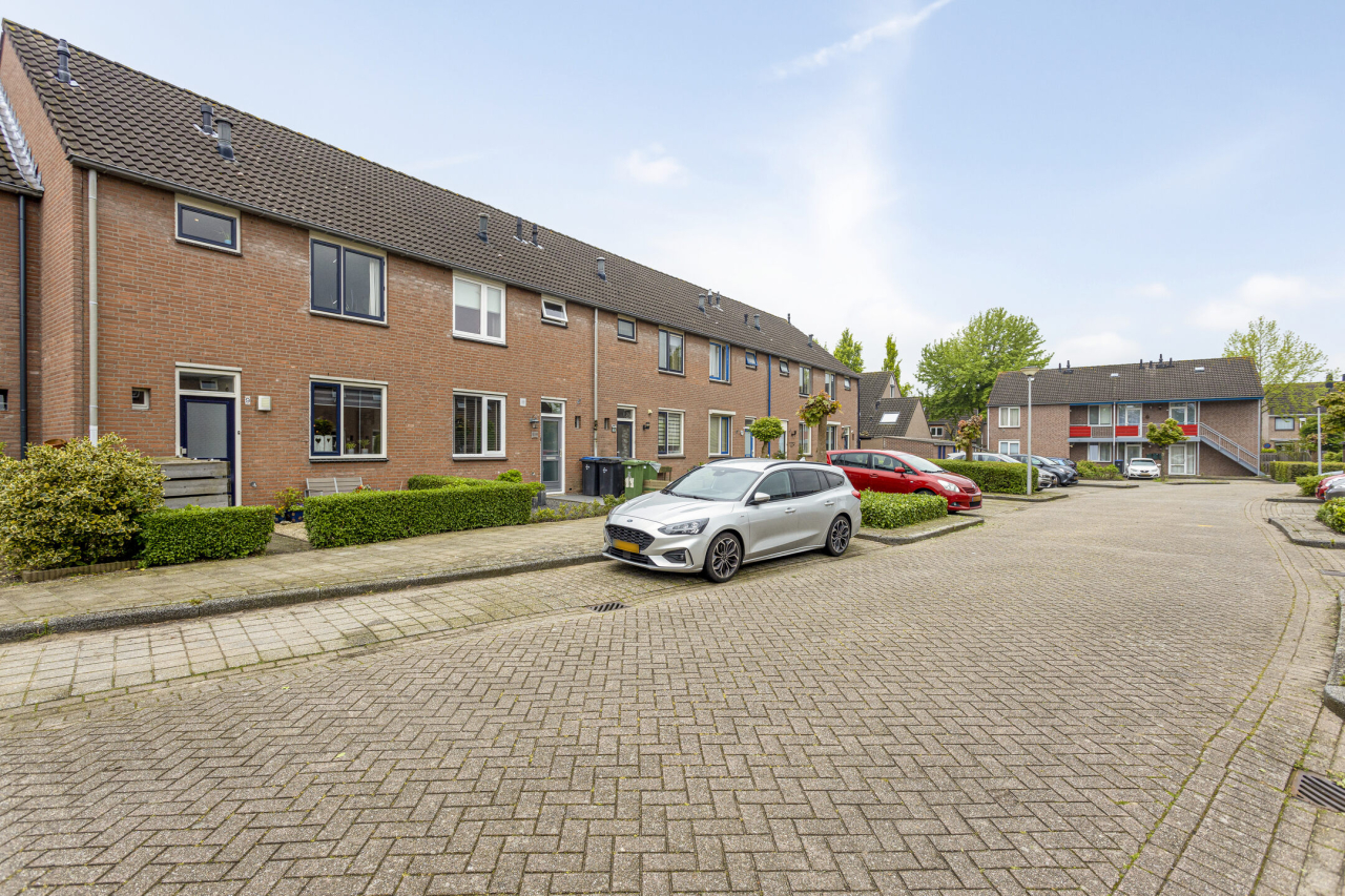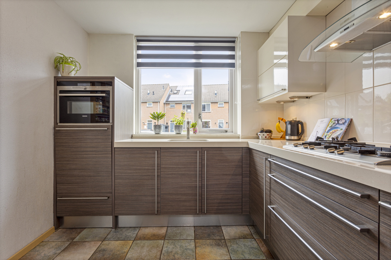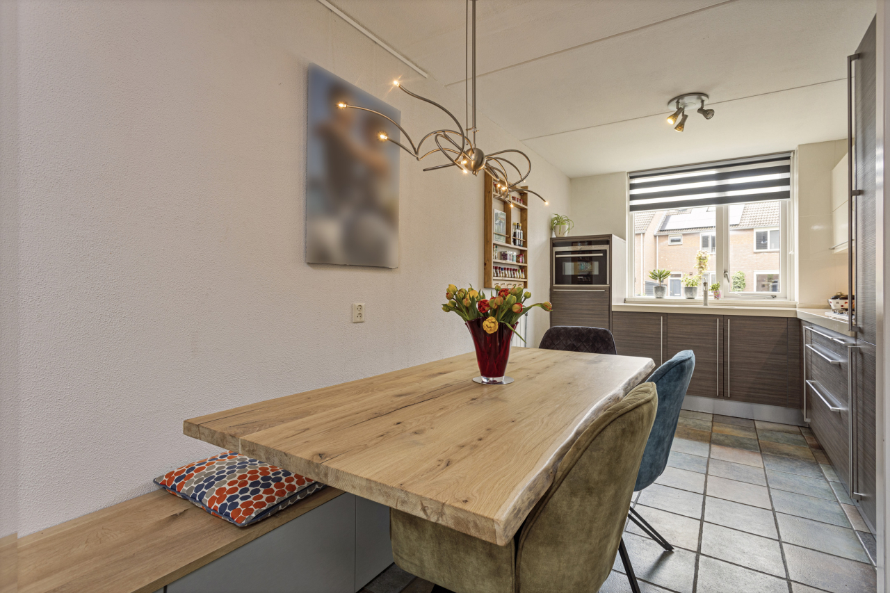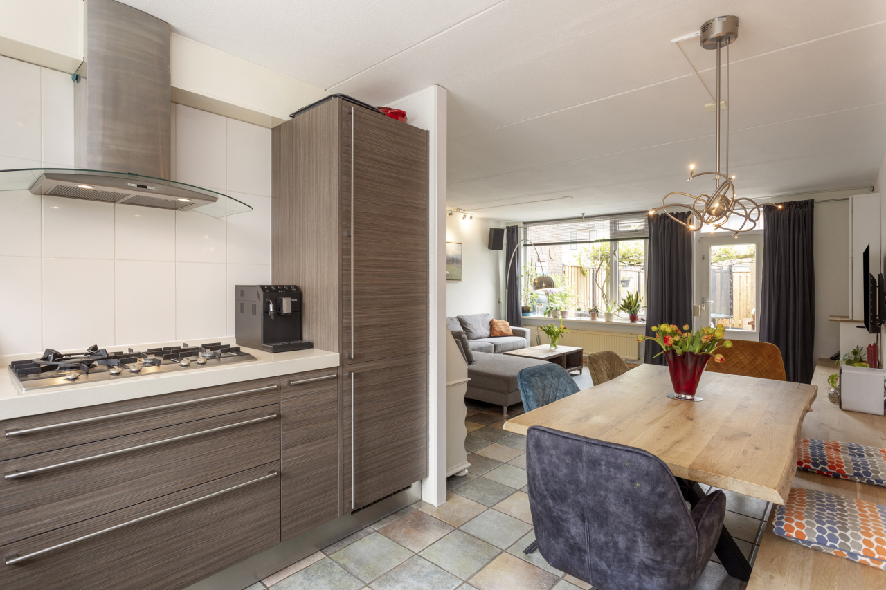 De lichte woonkamer is voorzien van een trapkast en een tegelvloer in aardetinten. Aan de achterzijde is de zithoek met zicht op de tuin. Via een tuindeur is het terras, de berging en zonnige tuin op het Zuiden bereikbaar. De deur en het raam zijn voorzien van een rolluik.