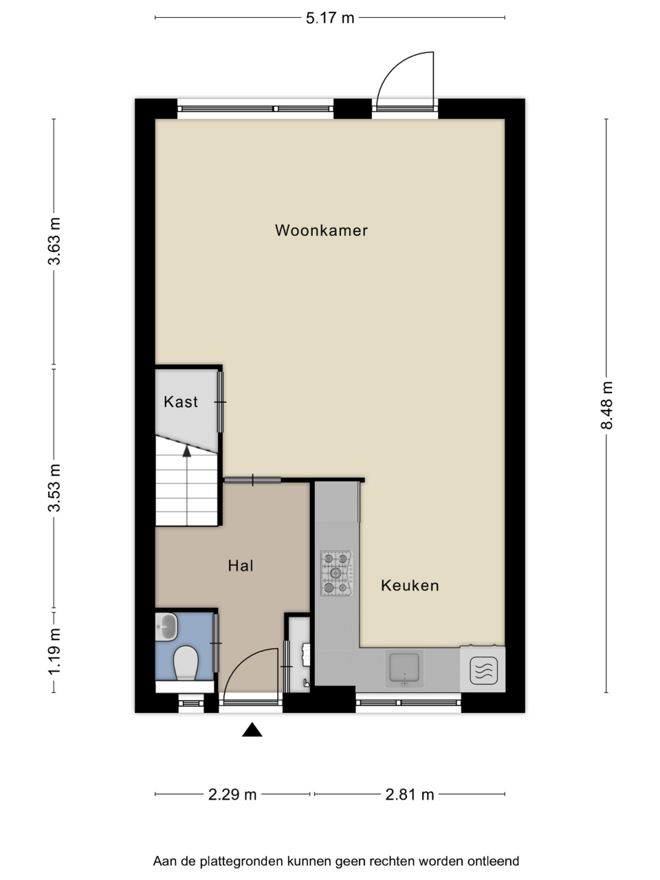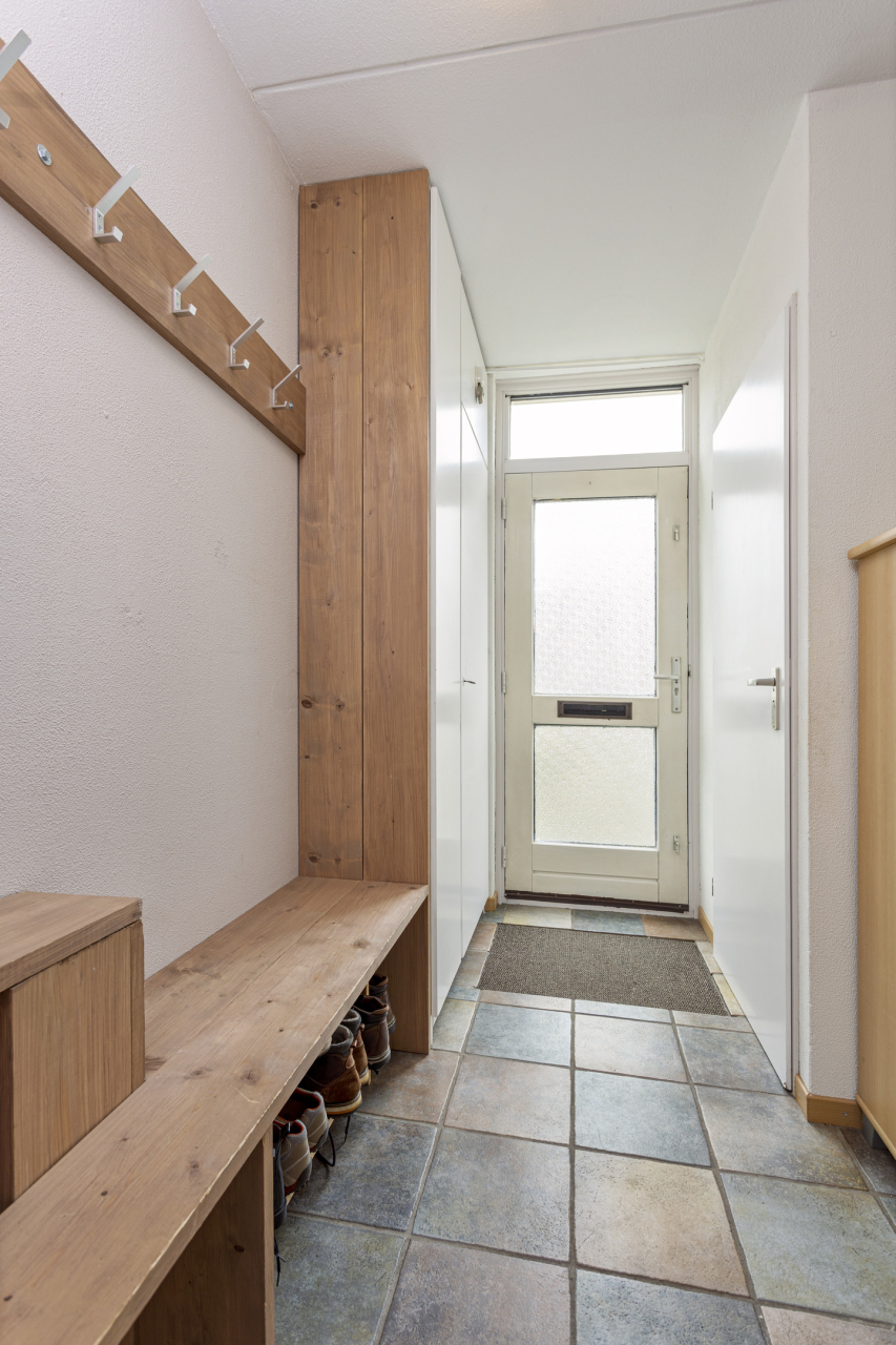 De entree van de woning is aan de voorzijde. Vanuit de hal met garderobe, trapopgang, meterkast , hoge bergkast en modern toilet met fonteintje is de woonkamer bereikbaar.
