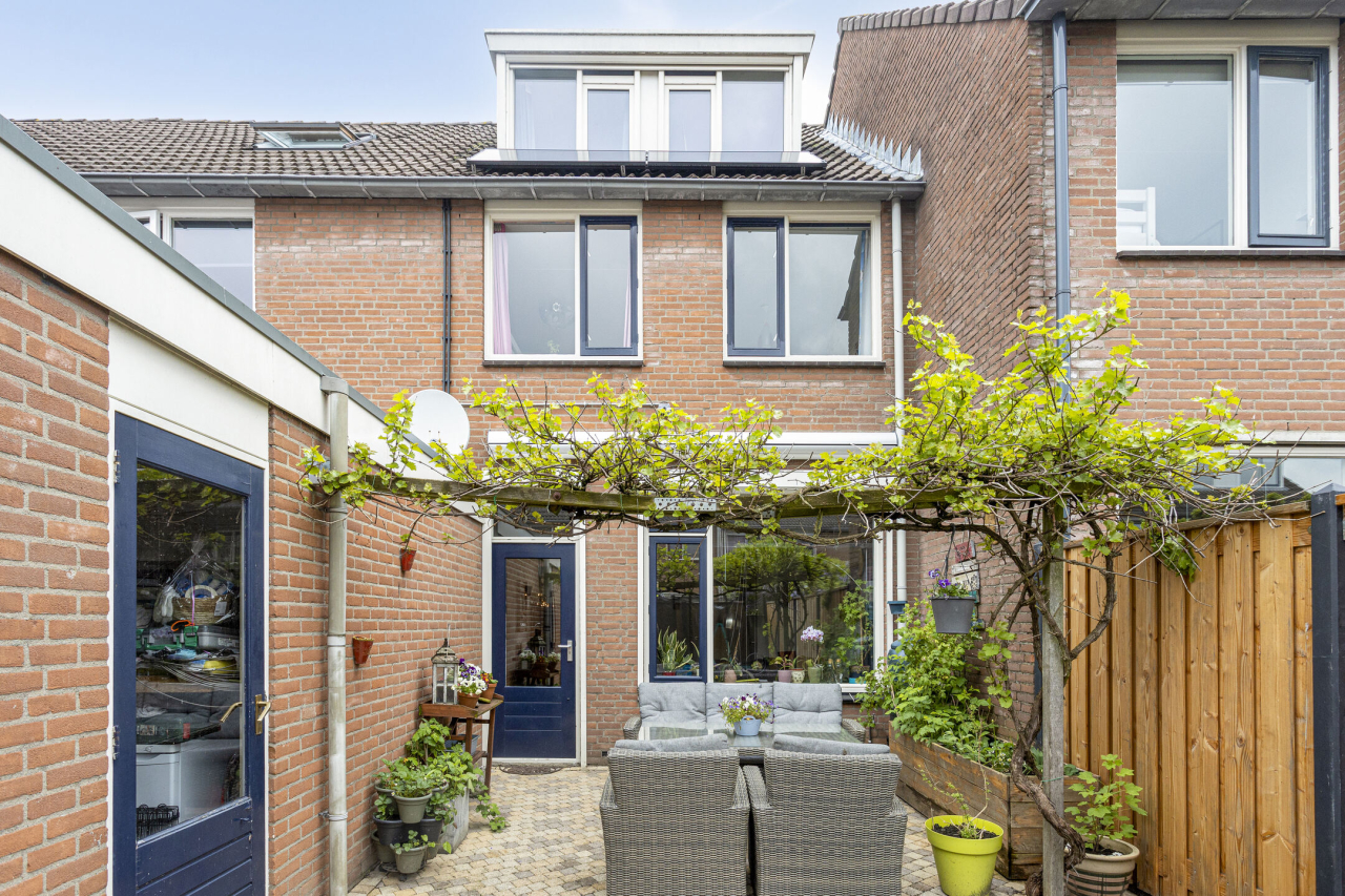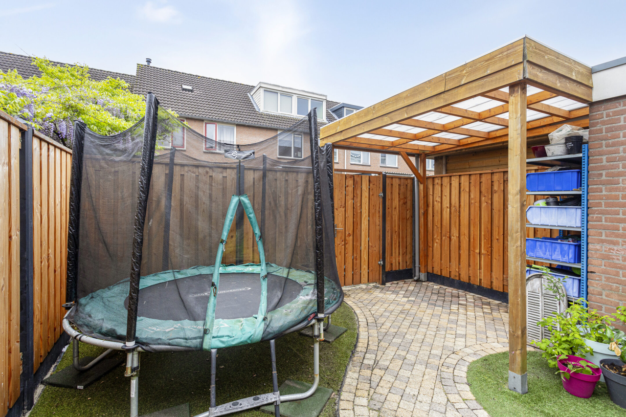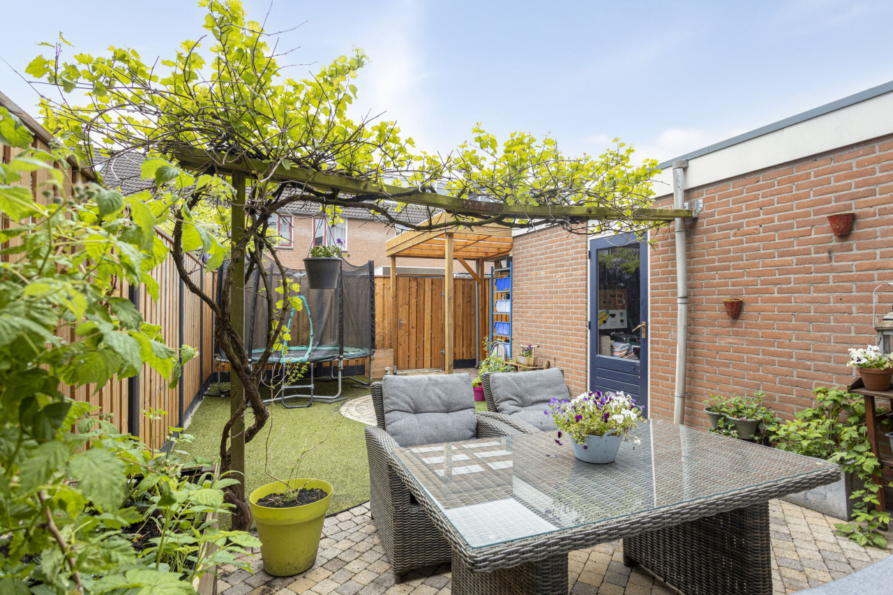 Achter de woning ligt een zonnige, onderhoudsvriendelijke tuin met sierbestrating , pergola met druif, kunstgras en een achterom. Met een groot terras met elektrisch zonnescherm direct achter de woning en toegang tot de stenen berging met daarachter een overkapping. Bijzonder praktisch voor de fietsen en tuinmaterialen.