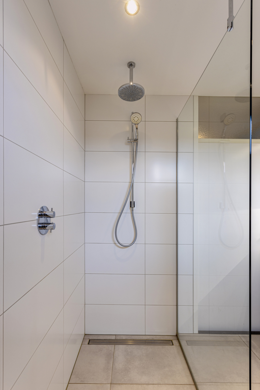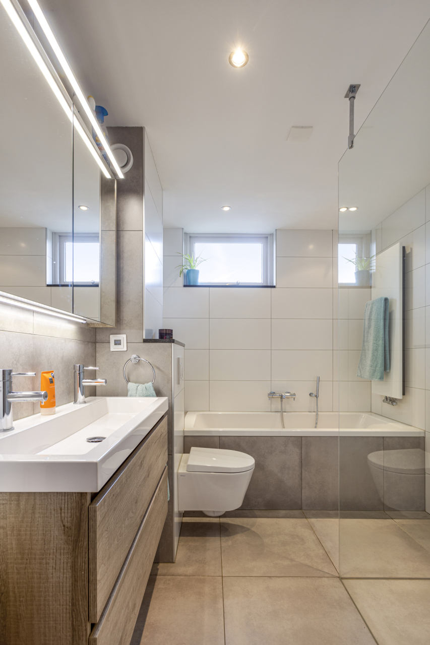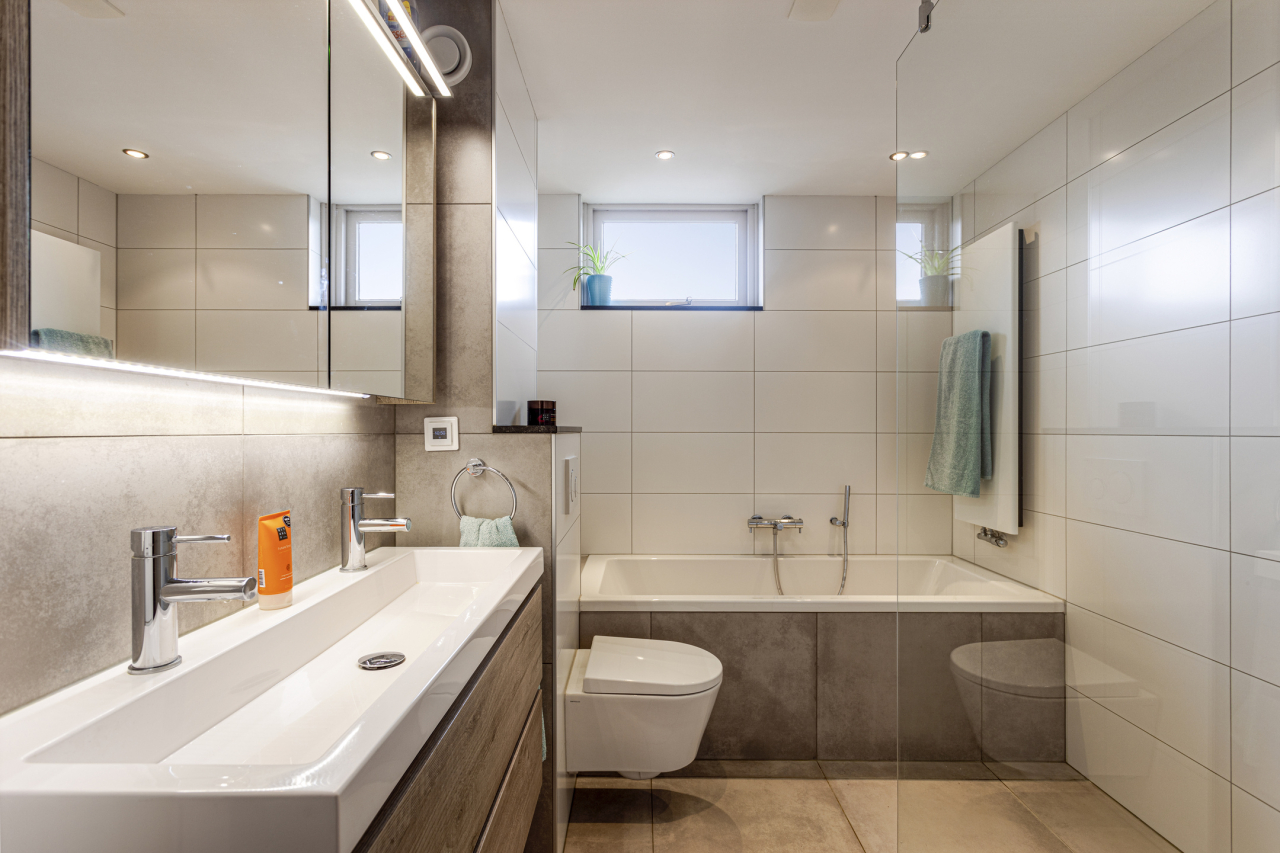 De ruime, volledig betegelde badkamer met vloerverwarming en inbouwspots is ingericht met een ligbad met handdouche. Daarnaast is er een inloopdouche met ingebouwde regendouche en een handdouche, een dubbel wastafelmeubel, een designradiator en een 2e hangend toilet.